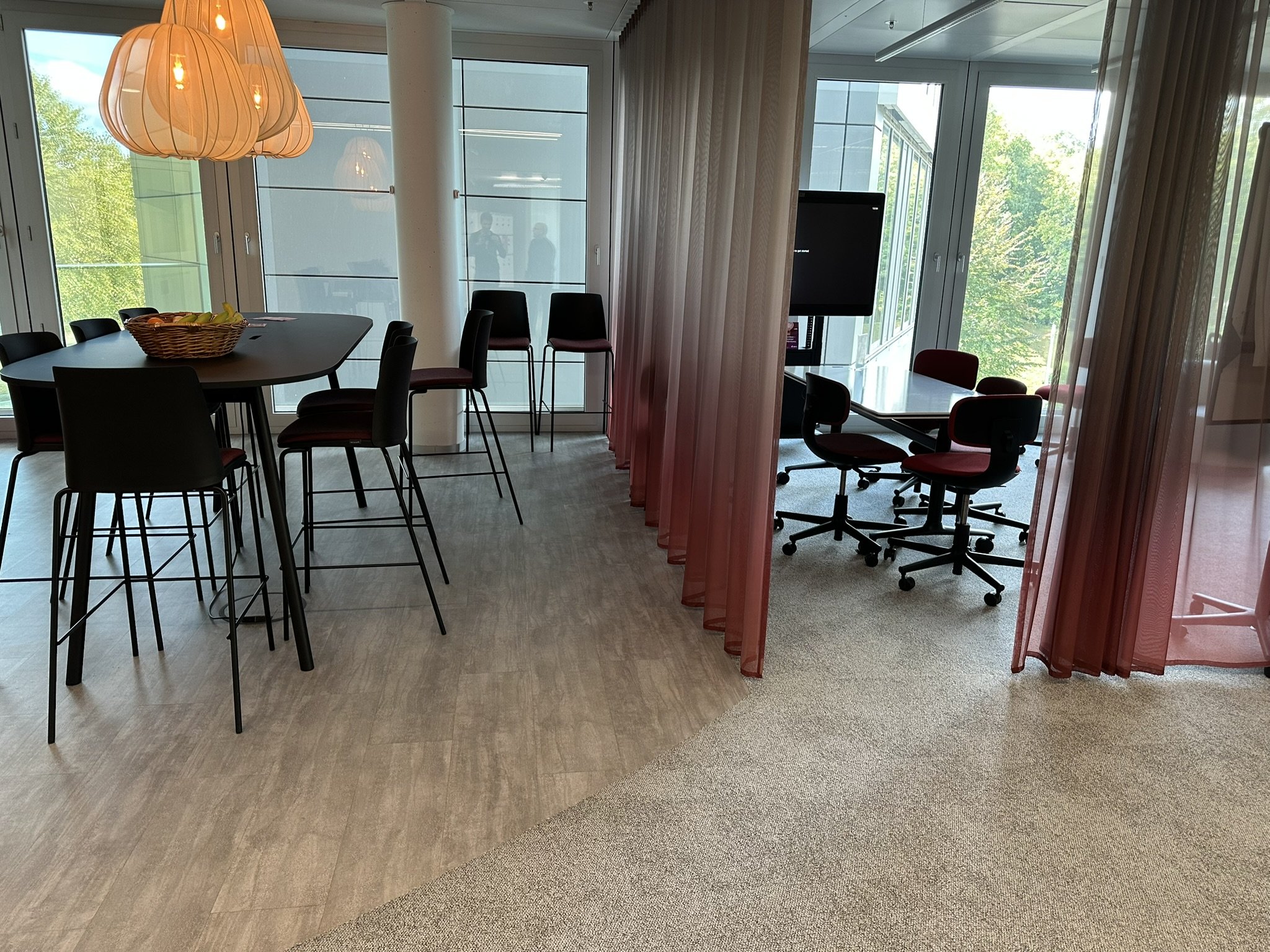 Für einen namhaften Energieversorger aus Essen wurden im Jahr 2024 insgesamt 34 Loungebereiche mit insgesamt 5400 qm an Oberbodenfläche verlegt. Zum Einsatz gekommen sind Teppichfließen und LVT der Firma Interface. Die Flächen werden auf insgesamt 17 Stockwerken verteilt von den Mitarbeitern genutzt.